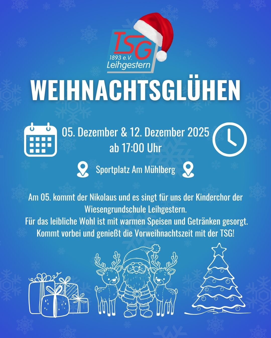 Auch in diesem Jahr lädt die TSG Leihgestern wieder herzlich zum traditionellen Weihnachtsglühen auf dem Sportplatz Am Mühlberg ein. An zwei stimmungsvollen Abenden, am Freitag, den 5. Dezember, und Freitag, den 12. Dezember 2025, erstrahlt das Vereinsgelände ab 17:00 Uhr in festlichem Glanz.